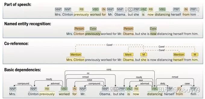 面向不同NLP任务,人们制定不同的待预测的语义结构空间:文本分类是最简单的情形,即预定义的类别体系,最常见的如情感分类是postive、neutral、negative三类;中文分词是词边界的标记;词性标注是句子中每个词的词性标签(如名词、动词、形容词、副词、连词、介词等);命名实体识别是标记哪些词(或多词)是实体名及其实体类型(如人名、地名、机构名等);共指消解是标记哪些词在做指代以及指代的是前面出现的哪个概念或实体;句法分析则是将句子背后的句法树结构或依存结构预测出来。